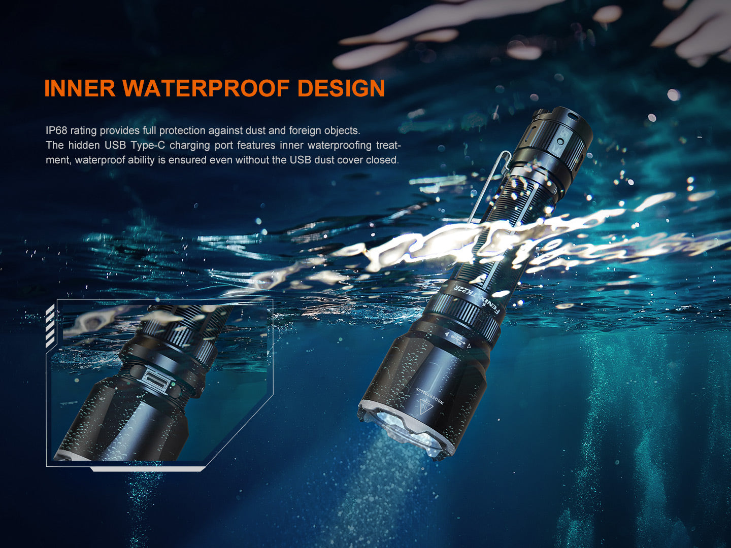 This flashlight boasts durability with tungsten steel alloy striking tips and double springs, optimized for tactical use. Innovative APF technology ensures consistent brightness, while intelligent overheat protection keeps performance optimal. Even with its charging port exposed, its resilience shines through, maintaining a waterproof rating of IP68.